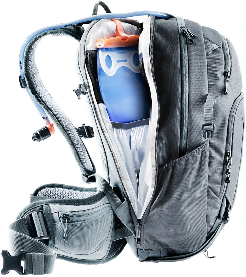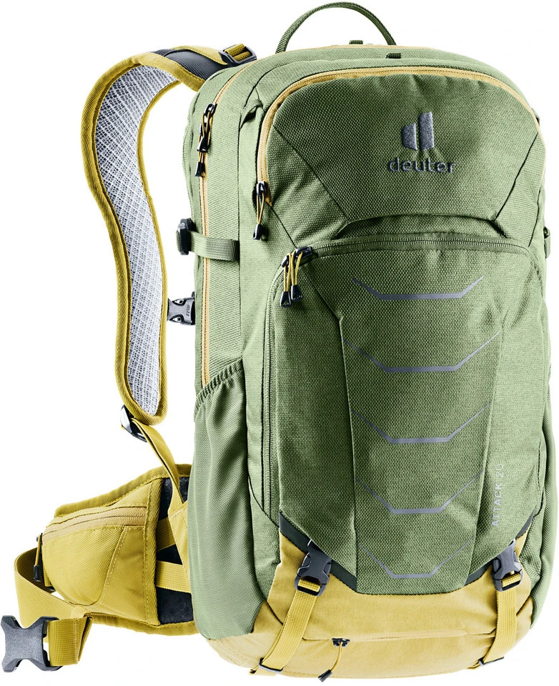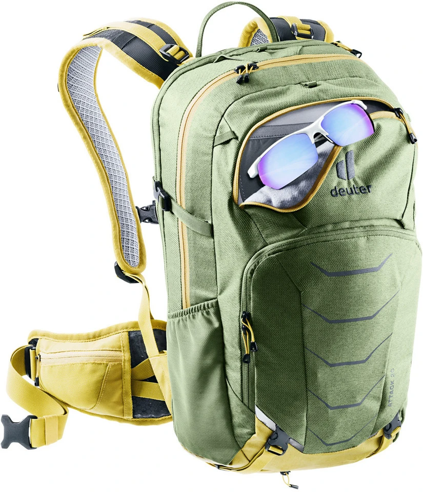 Der Attack 20 Protektorenrucksack von deuter verfügt über ein extra Trinkblasenfach, zwei elastische Seitentaschen und einen Multishock SAS-Rückenprotektor. So bringst Du Deine Ausrüstung problemlos unter und bist bei Stürzen auf Enduro-Trails geschützt.