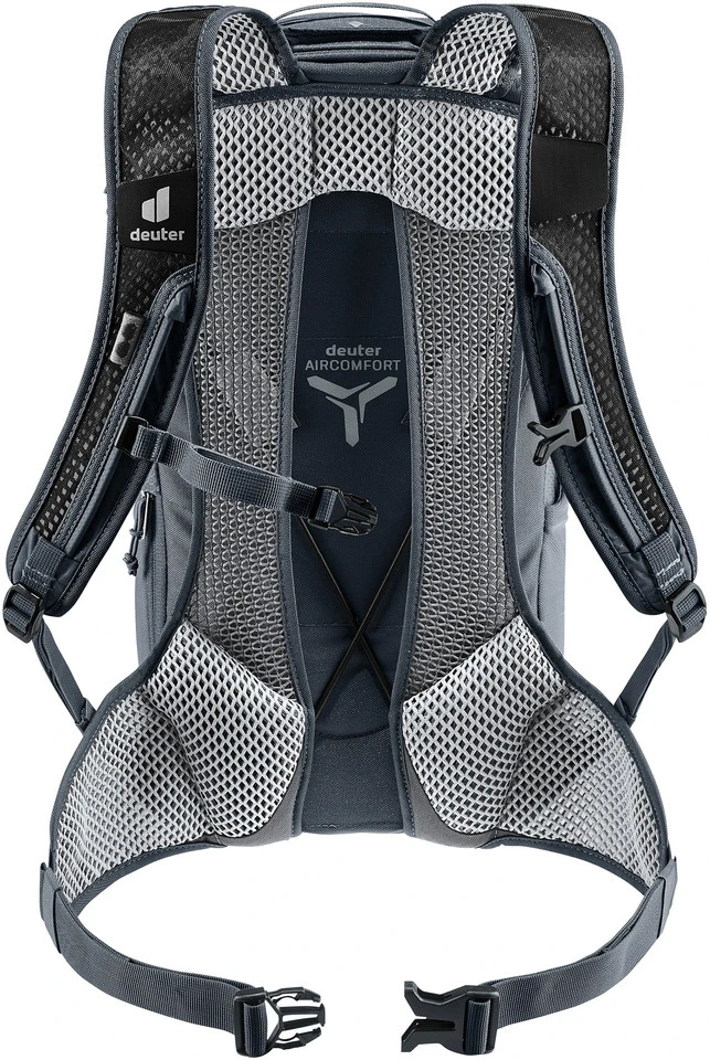 Das Aircomfort-Tragesystem ist äußerst atmungsaktiv, sodass der Rücken auch bei starker sportlicher Betätigung trocken bleibt. Dafür sorgt ein Rückenteil aus Netzstoff, das in der Mitte geteilt ist, wodurch die Auflagefläche minimiert wird. Hüftgurt und Schulterträger sind ebenfalls zur Belüftung perforiert. Außerdem folgt das Tragesystem Deiner Rückenform z. B. bei gebeugter Fahrhaltung.