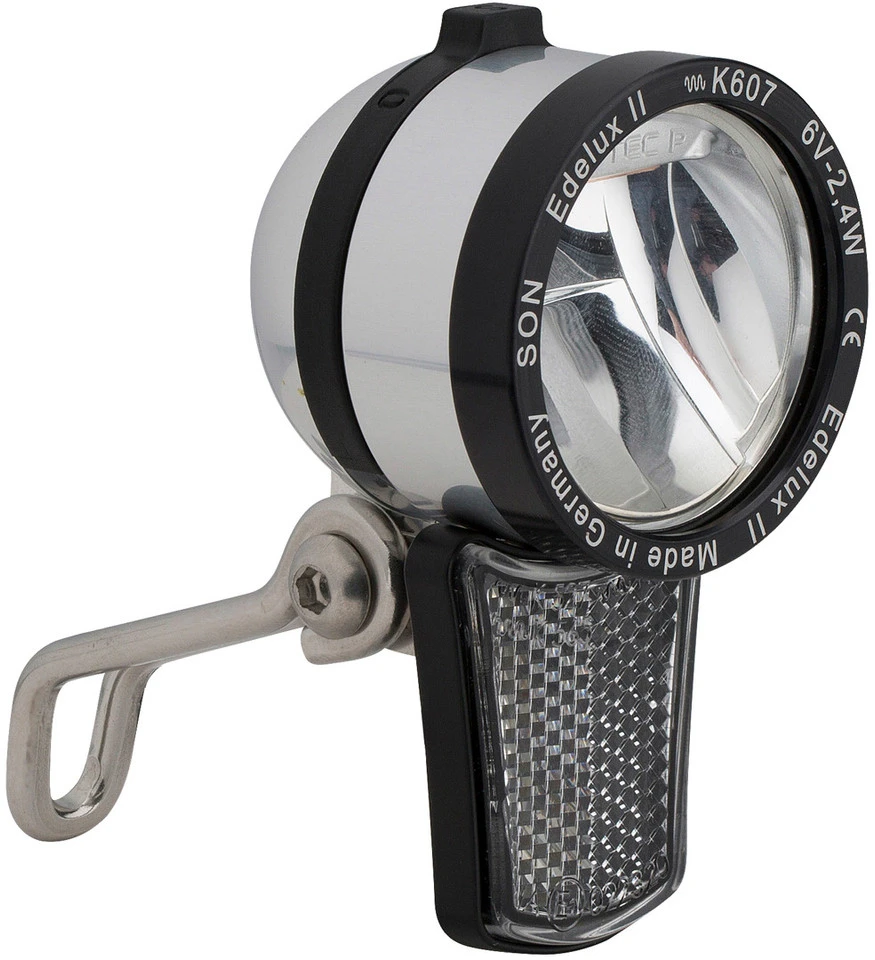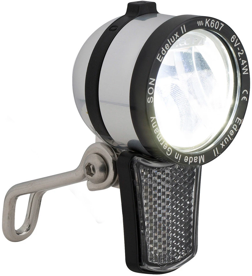 Spezifikationen:Ausführung:Frontlicht (weiß)Montage:Lenker (140 cm Kabel) oder Gabelkopf (60 cm Kabel)Leuchtmittel:LED (1)Leuchtkraft:100 LuxBetriebsmittel:NabendynamoTechnische Daten:Material:Aluminium (6082-T6)Standlicht:Ja (nicht abschaltbar)Schalter:Ein / Aus / Automatik (Sensor)Freigaben:Zulassung im Straßenverkehr:Ja, für Fahrräder (nach §67 StVZO)Prüfziffer:K~~607Features:100 Lux auf 10 m Distanz, 35 km/h3 Watt Hochleistungs-LED (>100 lm/W)30 % mehr Lichtbreites, homogenes Lichtfeldrobustes AlugehäuseKondensator-Standlicht und Lichtsensor-AutomatikSchaltring mit Magnet, Reed-Kontaktsolide mechanische und elektrische AusführungSchalter und Gehäuse spritzwasserdichteffizient und schonend betriebene LED durch optimale Kühlung mittels Kupfer-KühlkörperKoaxialkabel, PVC-frei, 3 mm DurchmesserKabellänge 60 cm (anschlussfertig für Son) oder 140 cm (mit losen Kabelschuhen)Rücklichtanschluss Flachstecker 2,8 mm und Ringkabelschuh (beiliegend)O-Ring-Dichtung (2x), Elektronik vergossenkann auch mit Seitenläuferdynamo betrieben werdenMade in TübingenFinish eloxiert oder poliertHerstellernummern:schwarz-eloxiert 60 cm:680615schwarz-eloxiert 140 cm:681416silber-poliert 60 cm:680605silber-poliert 140 cm:681406rot-eloxiert 60 cm:680625rot-eloxiert 140 cm:681426silber-eloxiert 60 cm:680695silber-eloxiert 140 cm:681496blau-eloxiert 60 cm:680645blau-eloxiert 140 cm:681446Lieferumfang:1 x Frontscheinwerfer SON Edelux II1 x Scheinwerferhalter SON Edelux1 x Anbaureflektor1 x Anschlussmaterial-Set