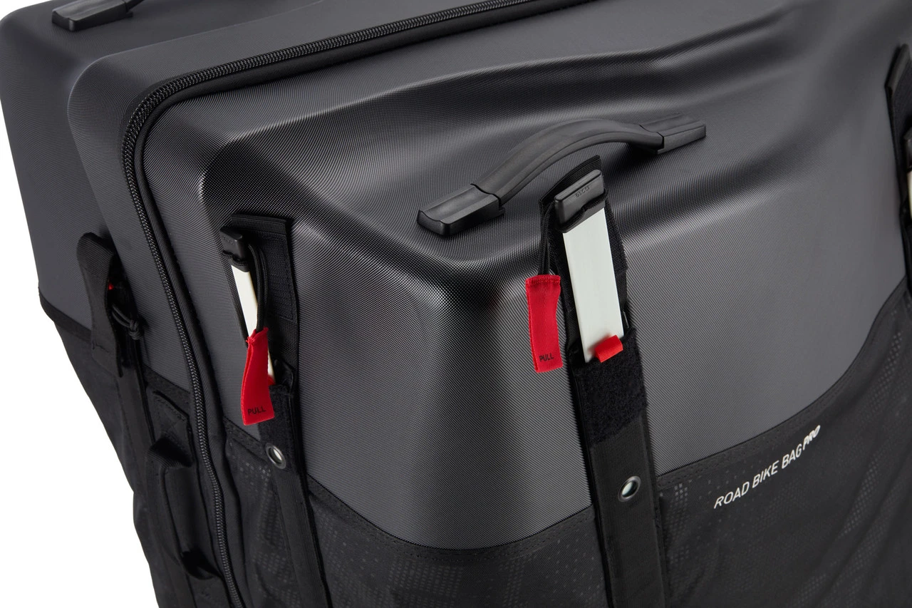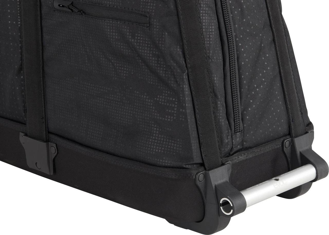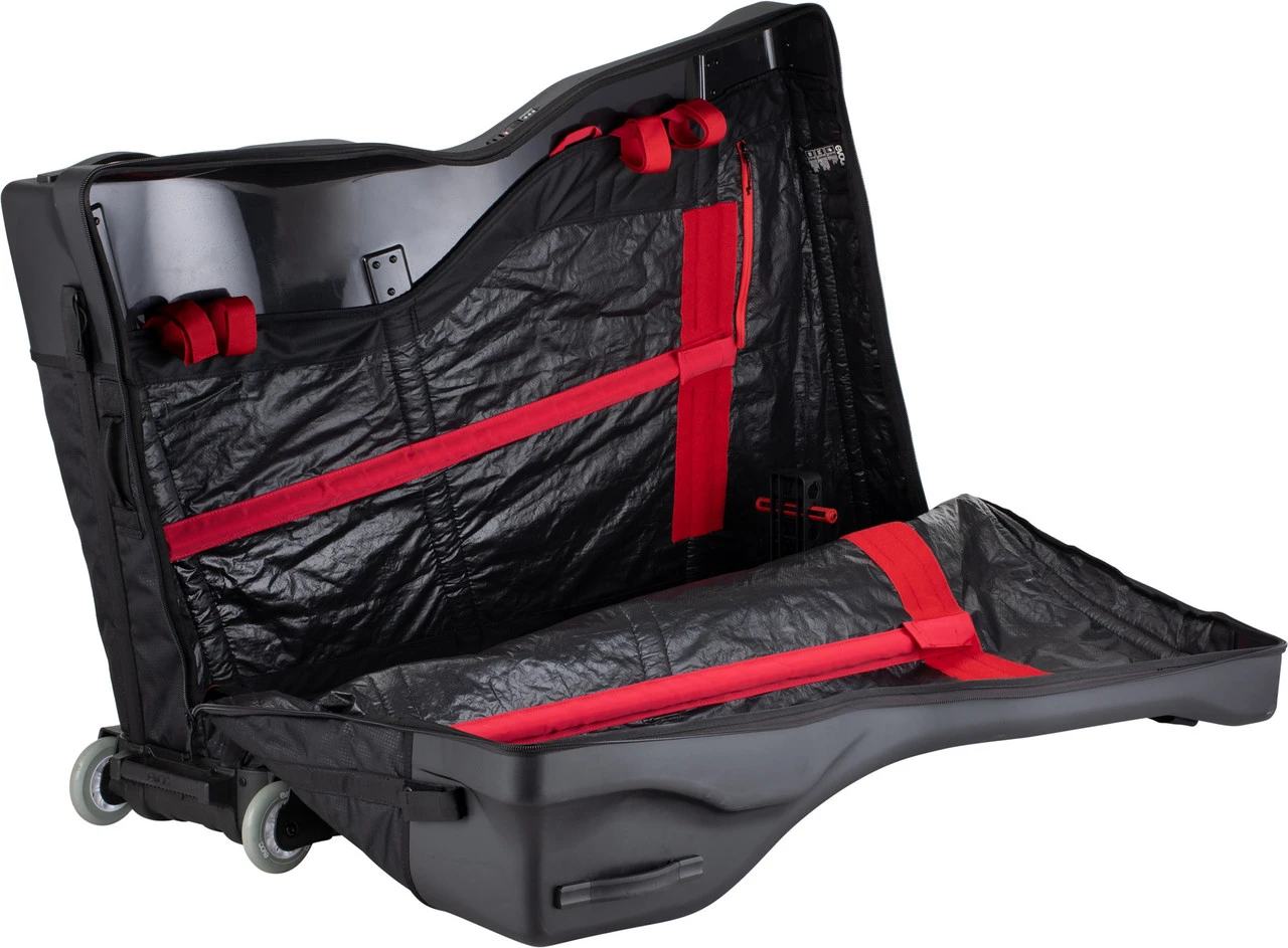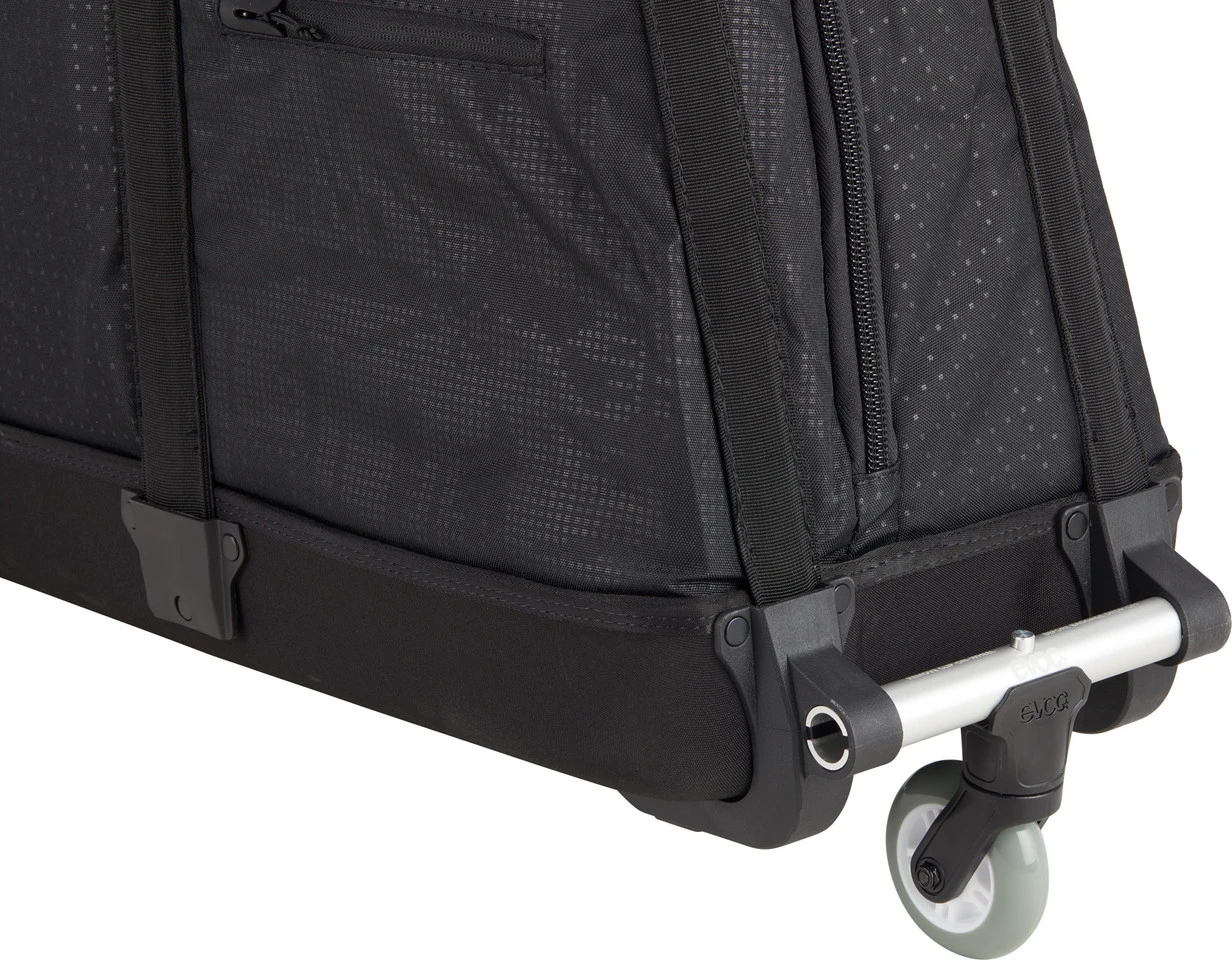 Mit der Road Bike Bag Pro Fahrrad-Transporttasche von evoc ist Dein Rennrad auf Reisen bestens untergebracht. Die Kombination aus Hartschale und Softcase schützt vor Schlägen und ist dennoch flexibel für unterschiedliche Bikes. Dank des Bike-Fitting-Proof-Designs lässt Du Sattel und Cockpit montiert, eine lästige Neueinstellung entfällt also. Für einen unkomplizierten Transport ist die Tasche rollbar und verfügt sogar über ein drittes, ansteckbares Rad. Der Fahrradhalter sorgt nicht nur beim verpackten Rad für einen stabilen Stand, sondern erleichtert Dir auch die Montage von Laufrädern und Pedalen am Zielort.