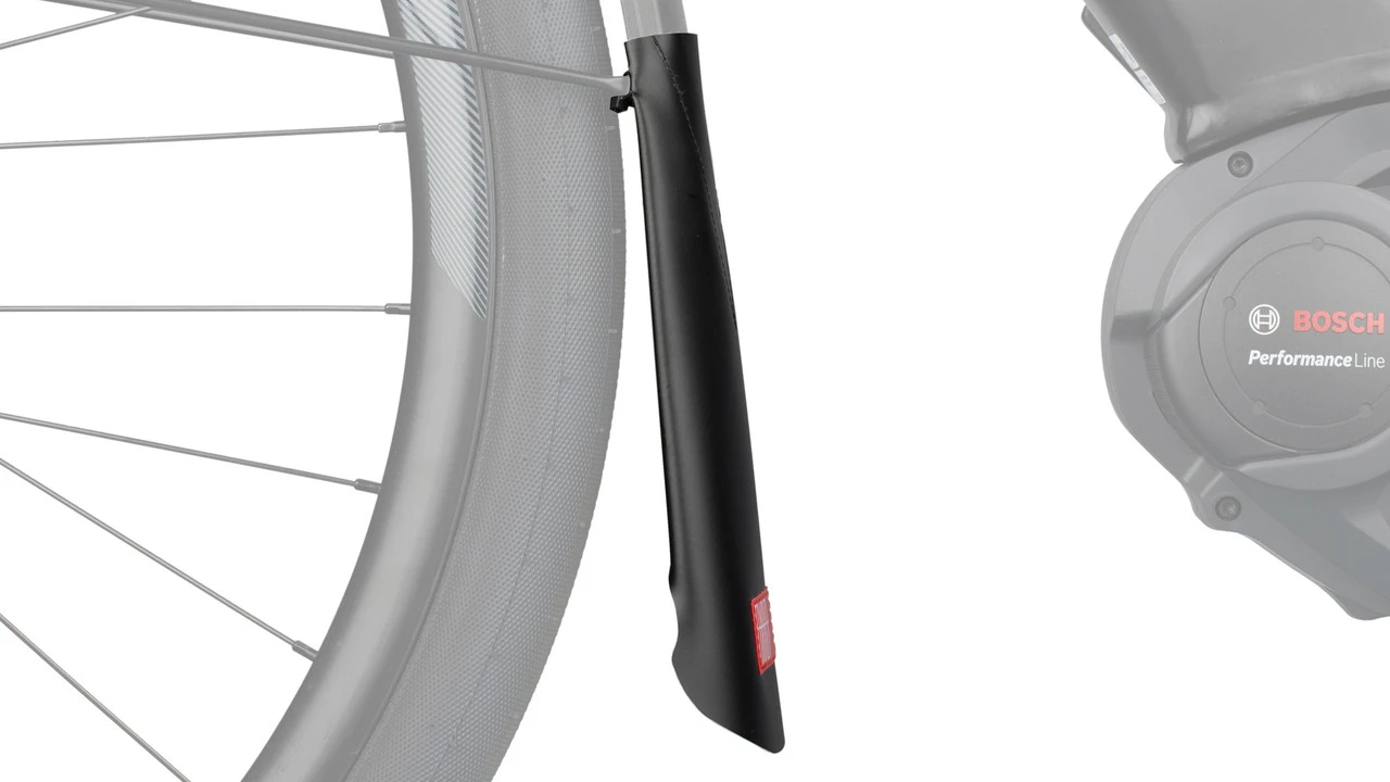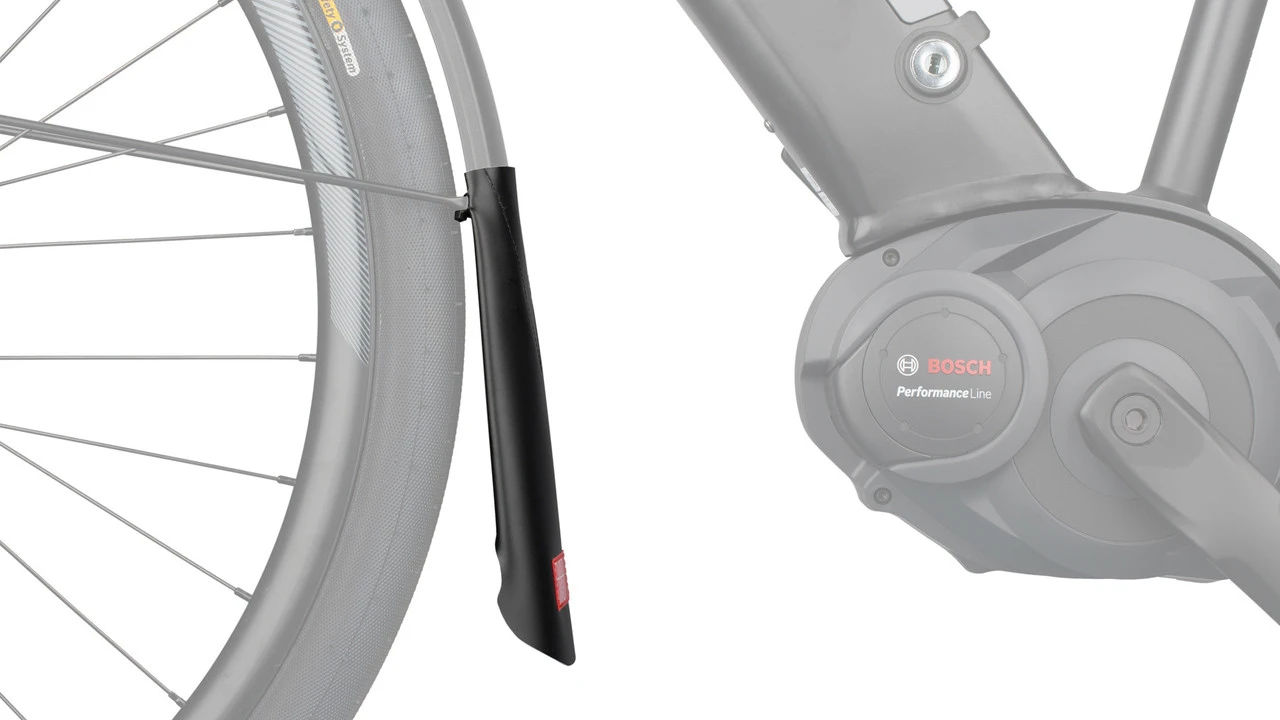 Der FAHRER E-Bike Spritzschutz Latz (Modell E) dient als VerlĂ€ngerung des vorderen Schutzblechs und sorgt auch bei höheren Geschwindigkeiten fĂŒr zusĂ€tzlichen Schutz vor Spritzwasser.