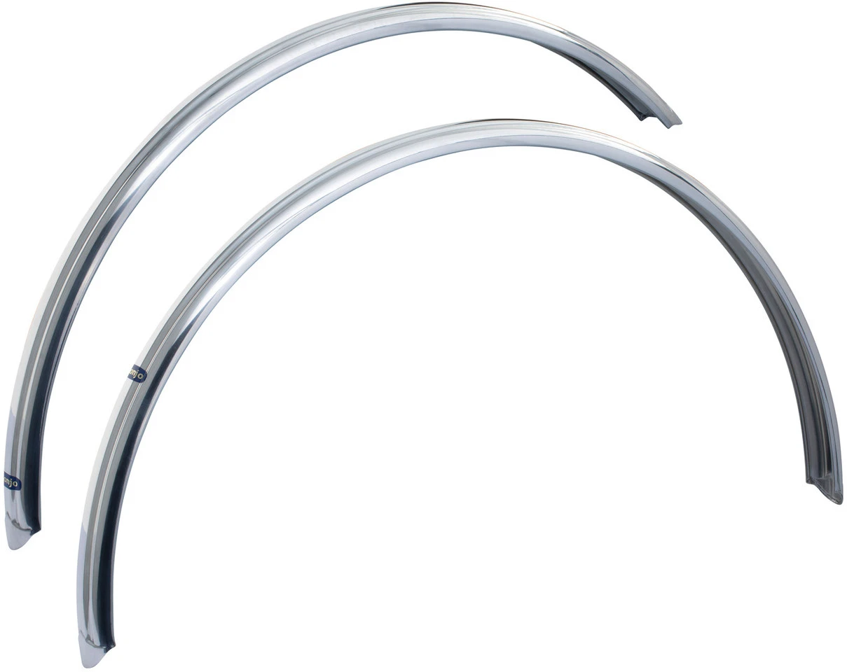 Das H29 Schutzblech Set von Honjo gehört zu den legendären auf Hochglanz polierten Klassikern aus Japan. Die Schutzbleche decken eine Reifenbreite von bis zu 33 mm ab. Mit dem besonders weit umfassenden Profil wird Spritzwasser einwandfrei im Blech gefangen gehalten. Das heißt, auch Füße und Kurbel bleiben trocken. Zudem verfügen die handgearbeiteten Schutzbleche von Honjo über eine edle Optik, ein geringes Gewicht und eine ausgesprochen lange Haltbarkeit.
