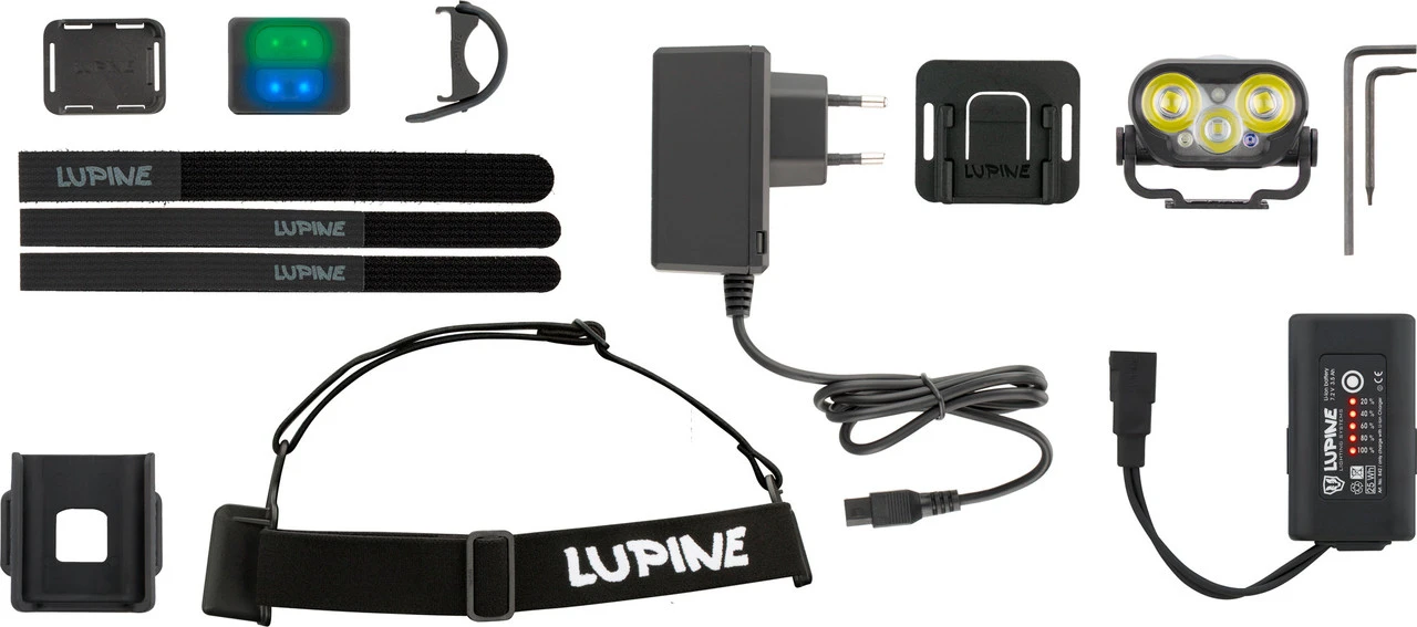 Lieferumfang:1 x Lampenkopf Lupine Blika R1 x Li-Ion Akku Lupine SmartCore FastClick 3,5 Ah1 x Fernbedienung Lupine Bluetooth1 x Stirnband Lupine mit FastClick und FrontClick Halterung1 x Helmhalter Lupine FrontClick1 x Akkuhelmhalter Lupine FastClick1 x Lenkerhalterung Lupine Peppi V51 x Ladegerät Lupine Wiesel1 x Funkhalterung Lupine