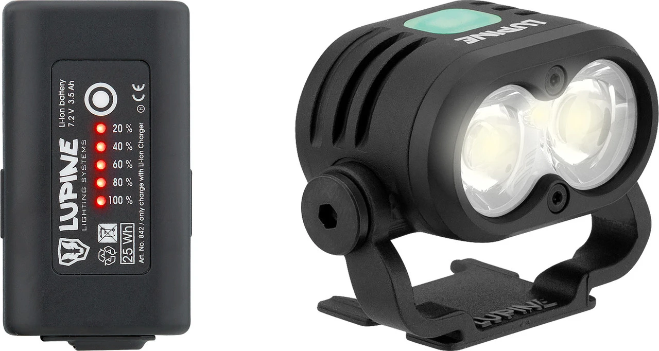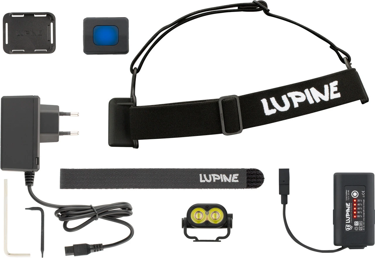 Lieferumfang:1 x Lampenkopf Lupine Piko R1 x Li-Ion Akku Lupine SmartCore FastClick 3,5 Ah1 x Fernbedienung Lupine Bluetooth1 x Stirnband Lupine mit FastClick und FrontClick Halterung1 x Armbandhalter Lupine für Bluetooth-Fernbedienung1 x Ladegerät Lupine Wiesel