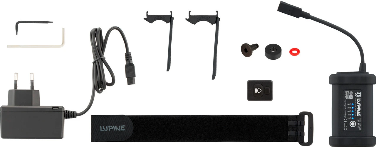 Lieferumfang:1 x Lampenkopf Lupine SL Nano AF1 x Li-Ion Akku Lupine SmartCore 5,0 Ah1 x Schnellspanner Lupine 31,8 mm1 x Fernbedienung Lupine Bluetooth1 x Lenkerhalter Lupine Peppi V5 für Bluetooth-Fernbedienung1 x Lenkerhalter Lupine Peppi XL für Bluetooth-Fernbedienung2 x Klettband Lupine1 x Extension Kit Lupine 5 mm1 x Ladegerät Lupine Wiesel