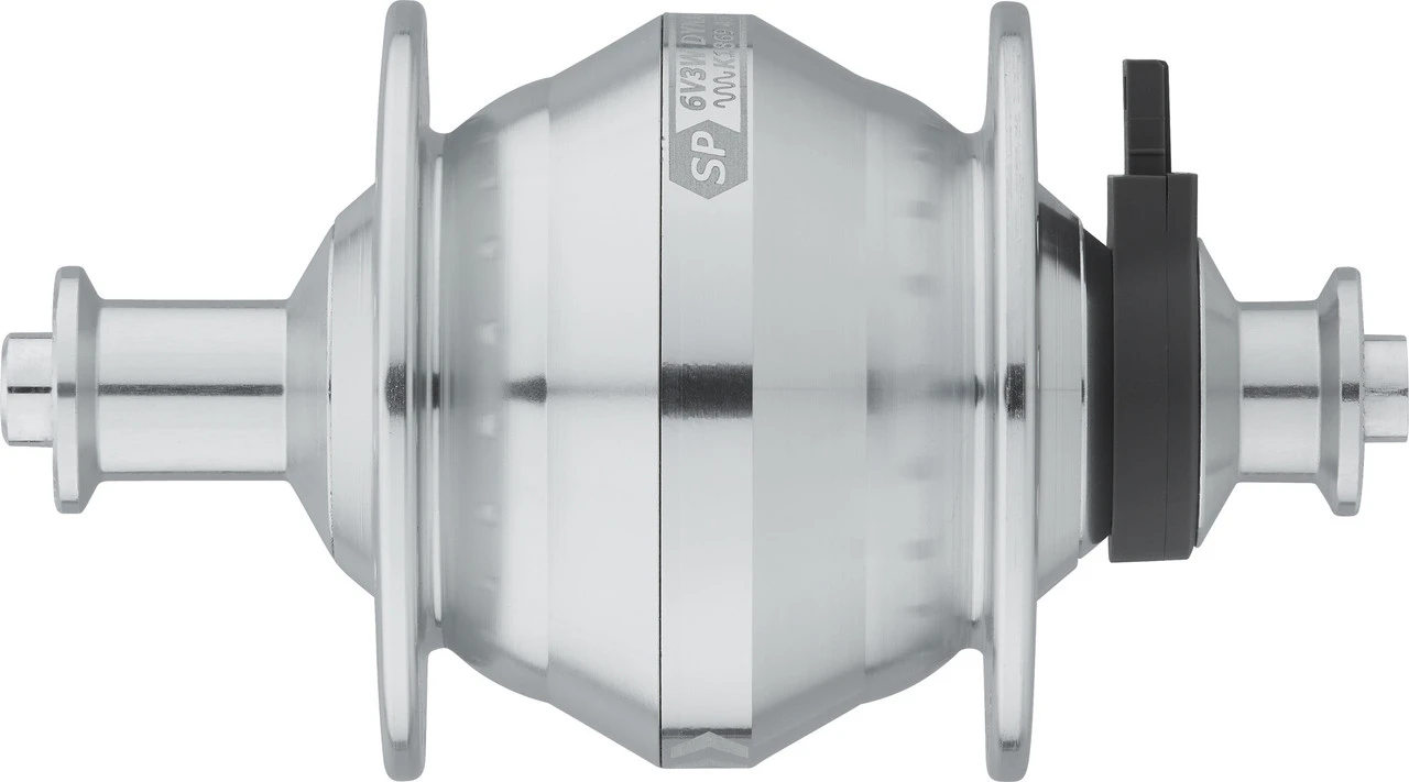 Der Shutter Precision SV-8 Nabendynamo für Fahrräder mit V-Brake liefert trotz seiner geringen Größe genügend Power auch für größere Laufräder.