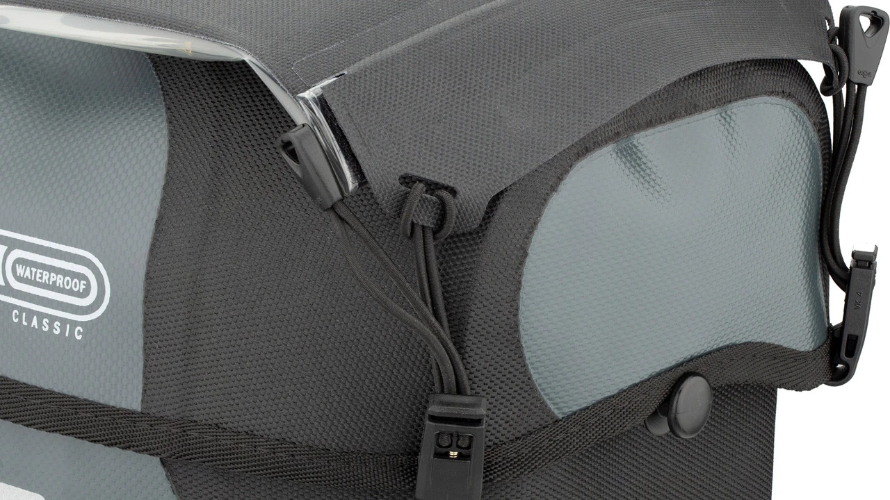 Vier verstellbare Montagehaken mit elastischer Kordel zur Befestigung von Safe-it S-XXL auf Ultimate Lenkertaschen.