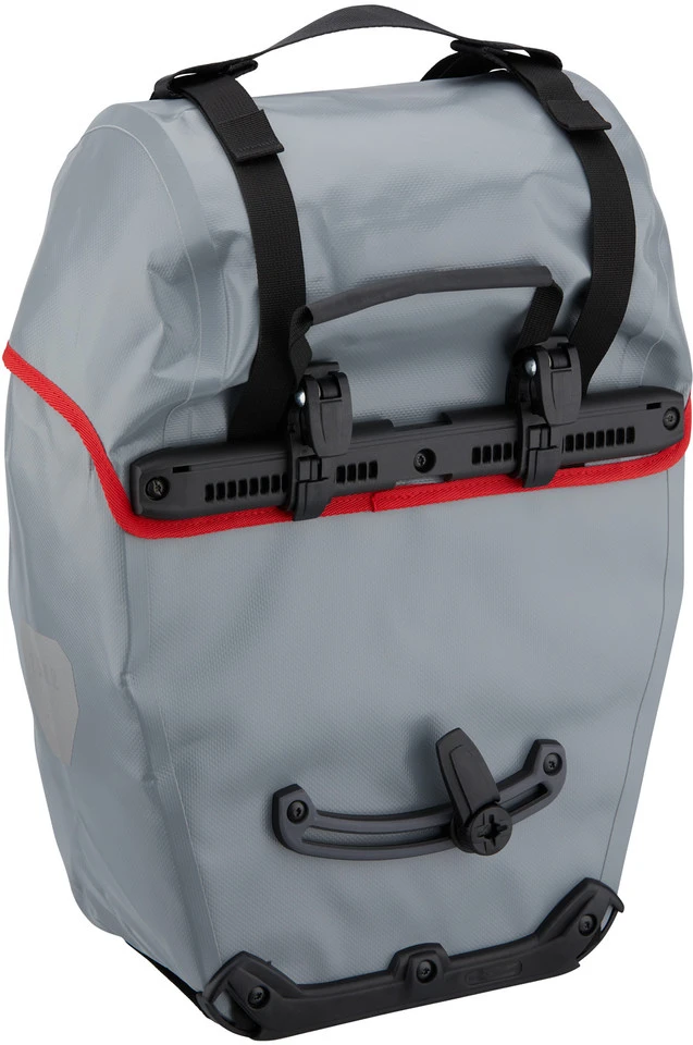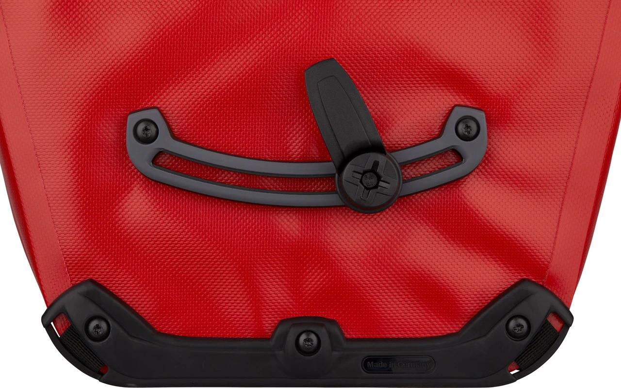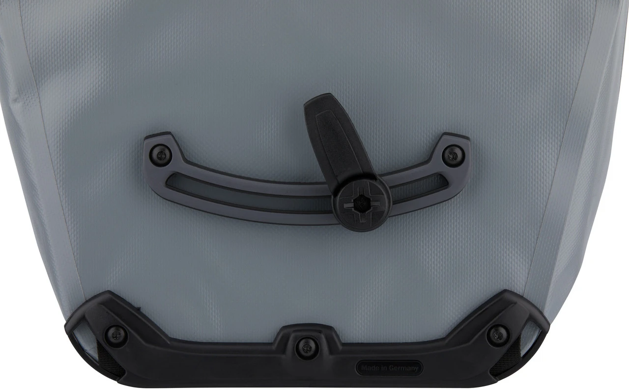 Das Quick-Lock2.1-Halterungssystem basiert auf dem bewährten Quick-Lock2-System, bietet jedoch einige Verbesserungen. Die obere Schiene, in der auch die optionale Diebstahlsicherung angebracht werden kann, ist einteilig ausgeführt, was ein Plus an Stabilität mit sich bringt. Auf der Innenseite kommen besonders flache Unterlegscheiben zum Einsatz, so wird der Tascheninhalt durch diese kaum beeinträchtigt. Der Taschengriff dient als Riegel: Hebst Du den Griff an, öffnen sich die Halterungshaken, lässt Du ihn los, schließen sie sich. Die Reduzierstücke für unterschiedliche Rohrdurchmesser werden seitlich eingeschoben und bleiben so sicher an Ort und Stelle, auf diese Weise werden Durchmesser von 8 bis 16 mm abgedeckt. Für Gepäckträger mit größeren Rohrdurchmessern von 18 oder 20 mm, wie sie teilweise an E-Bikes verbaut sind, kann der obere Haken einfach getauscht werden. Der Zwei-Komponenten-Kunststoff mit Anti-Scratch-Funktion, der für die untere Schiene in Form einer Halbellipse verwendet wird, sorgt für weiche Auflageflächen und reduziert die Reibung am Gepäckträger. Der untere Haken kann variabel angepasst und in 15-Grad-Schritten gedreht werden. Die Handhabung ist denkbar einfach: Für die Einstellung der Haken wird kein Werkzeug benötigt.