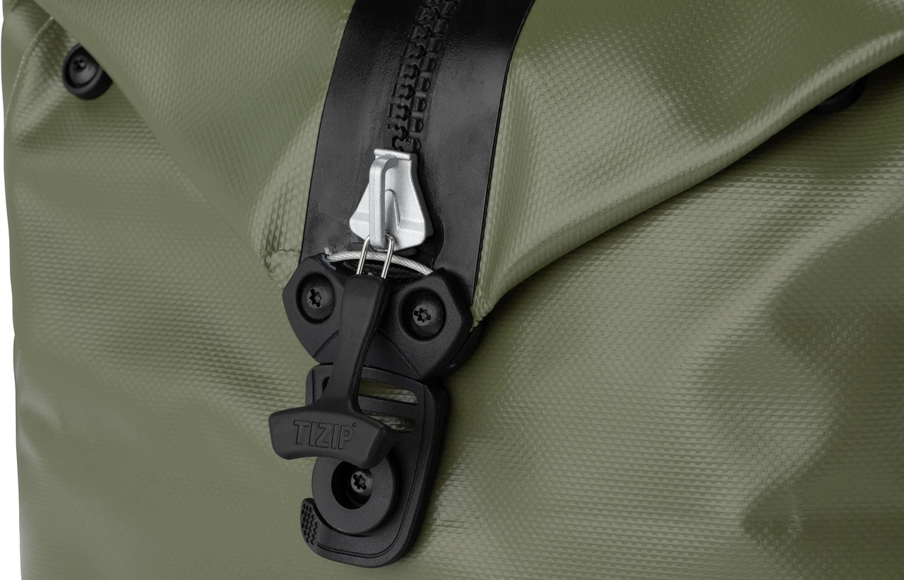 Der von ORTLIEB verwendete TIZIP-ReiĂverschluss besteht aus einem KunststoffspiralreiĂverschluss auf einem stabilen Gewebe. Dichtende ReiĂverschlĂŒsse ” gehen schwerer” als konventionelle ReiĂverschlĂŒsse und mĂŒssen deshalb regelmĂ€Ăig mit Gleitpaste gangbar gehalten werden. Produkte mit TIZIP-ReiĂverschluss eignen sich ĂŒberall dort, wo einerseits Schutz vor NĂ€sse und Staub gewĂ€hrleistet sein muss und andererseits ein schneller und bequemer Zugriff gefragt ist. Jede SpiralhĂ€lfte ist in einem Kunststoffprofil sicher eingebettet und fixiert. Beim SchlieĂen des ReiĂverschlusses werden die oberhalb und unterhalb der Spirale liegenden Dichtlippen aneinandergedrĂŒckt. Die ausgeklĂŒgelte Konstruktion verhindert eine Reibung des Schiebers an den Dichtlippen sowohl beim Ăffnen als auch beim SchlieĂen. Im Ăbrigen ist das Kunststoffprofil hochabriebfest. Die Physik des ReiĂverschlusses ist so ausgelegt, dass sich die Dichtigkeit bei einer Erhöhung des Innendruckes oder generell bei einer Querbelastung dadurch verbessert, dass die Dichtlippen stĂ€rker aneinandergepresst werden. Der ReiĂverschluss ist extrem unempfindlich gegen Schmutz und zeigt auch unter rauen Bedingungen bestes Stehvermögen und Langlebigkeit. Er ist trittfest, hoch abriebfest und vertrĂ€gt auch kurzfristig eine scharfe Knickung. Der ReiĂverschluss hat eine extrem hohe Querzugfestigkeit von 300 N/cm in geschlossenem Zustand.
