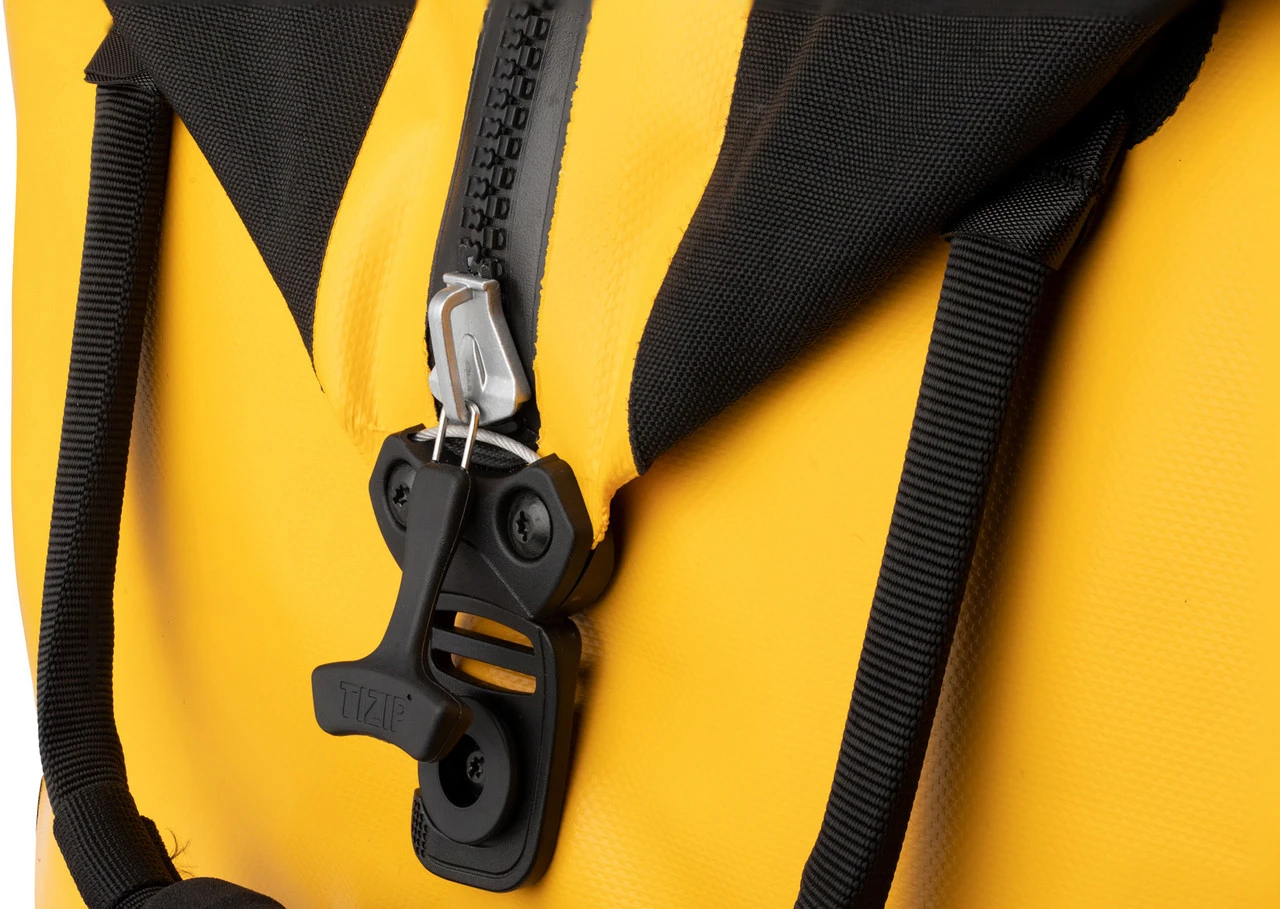 Der von ORTLIEB verwendete TIZIP-Reißverschluss besteht aus einem Kunststoffspiralreißverschluss auf einem stabilen Gewebe. Dichtende Reißverschlüsse ” gehen schwerer” als konventionelle Reißverschlüsse und müssen deshalb regelmäßig mit Gleitpaste gangbar gehalten werden. Produkte mit TIZIP-Reißverschluss eignen sich überall dort, wo einerseits Schutz vor Nässe und Staub gewährleistet sein muss und andererseits ein schneller und bequemer Zugriff gefragt ist. Jede Spiralhälfte ist in einem Kunststoffprofil sicher eingebettet und fixiert. Beim Schließen des Reißverschlusses werden die oberhalb und unterhalb der Spirale liegenden Dichtlippen aneinandergedrückt. Die ausgeklügelte Konstruktion verhindert eine Reibung des Schiebers an den Dichtlippen sowohl beim Öffnen als auch beim Schließen. Im Übrigen ist das Kunststoffprofil hochabriebfest. Die Physik des Reißverschlusses ist so ausgelegt, dass sich die Dichtigkeit bei einer Erhöhung des Innendruckes oder generell bei einer Querbelastung dadurch verbessert, dass die Dichtlippen stärker aneinandergepresst werden. Der Reißverschluss ist extrem unempfindlich gegen Schmutz und zeigt auch unter rauen Bedingungen bestes Stehvermögen und Langlebigkeit. Er ist trittfest, hoch abriebfest und verträgt auch kurzfristig eine scharfe Knickung. Der Reißverschluss hat eine extrem hohe Querzugfestigkeit von 300 N/cm in geschlossenem Zustand.