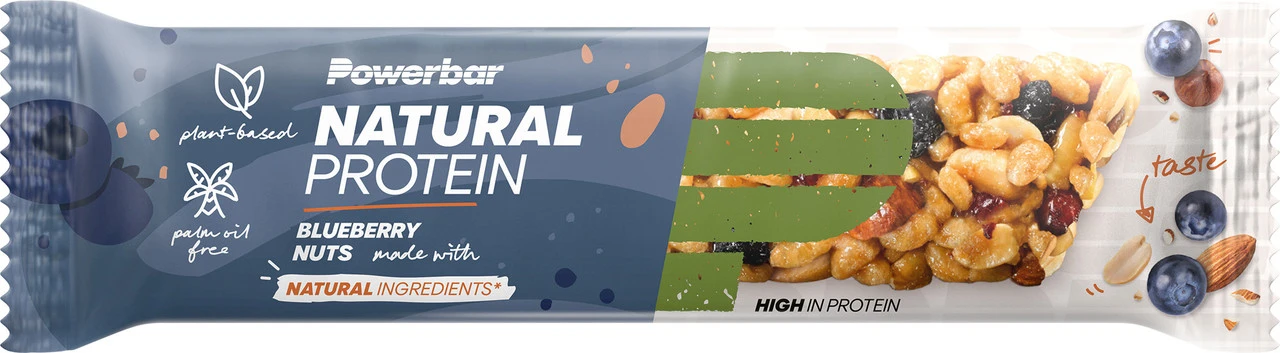 Sojacrisps (23,5 %) (isoliertes Sojaeiweiß*, Stärke*, Salz), Glukose-Fruktose-Sirup*, geröstete Erdnüsse* (10,9 %), Maltodextrin*, Sojabohnen* (7,2 %), Erbsenprotein* (6,3 %), Palmfett*, kandierte Cranberries* (5,4 %) (Zucker*, Cranberries*, Reismehl*, Sonnenblumenöl*), Fruktose, geröstete Mandeln* (4 %), kandierte Heidelbeeren* (3,4 %) (Heidelbeeren*, Zucker*, Reismehl*, Sonnenblumenöl*) Feuchthaltemittel (Glycerin*), natürliche Aromen*, Säuerungsmittel (Citronensäure*), Salz, Vanilleextrakt*, Emulgator (Sojalecithine*). * natürliche Zutat.