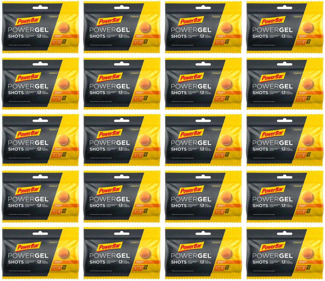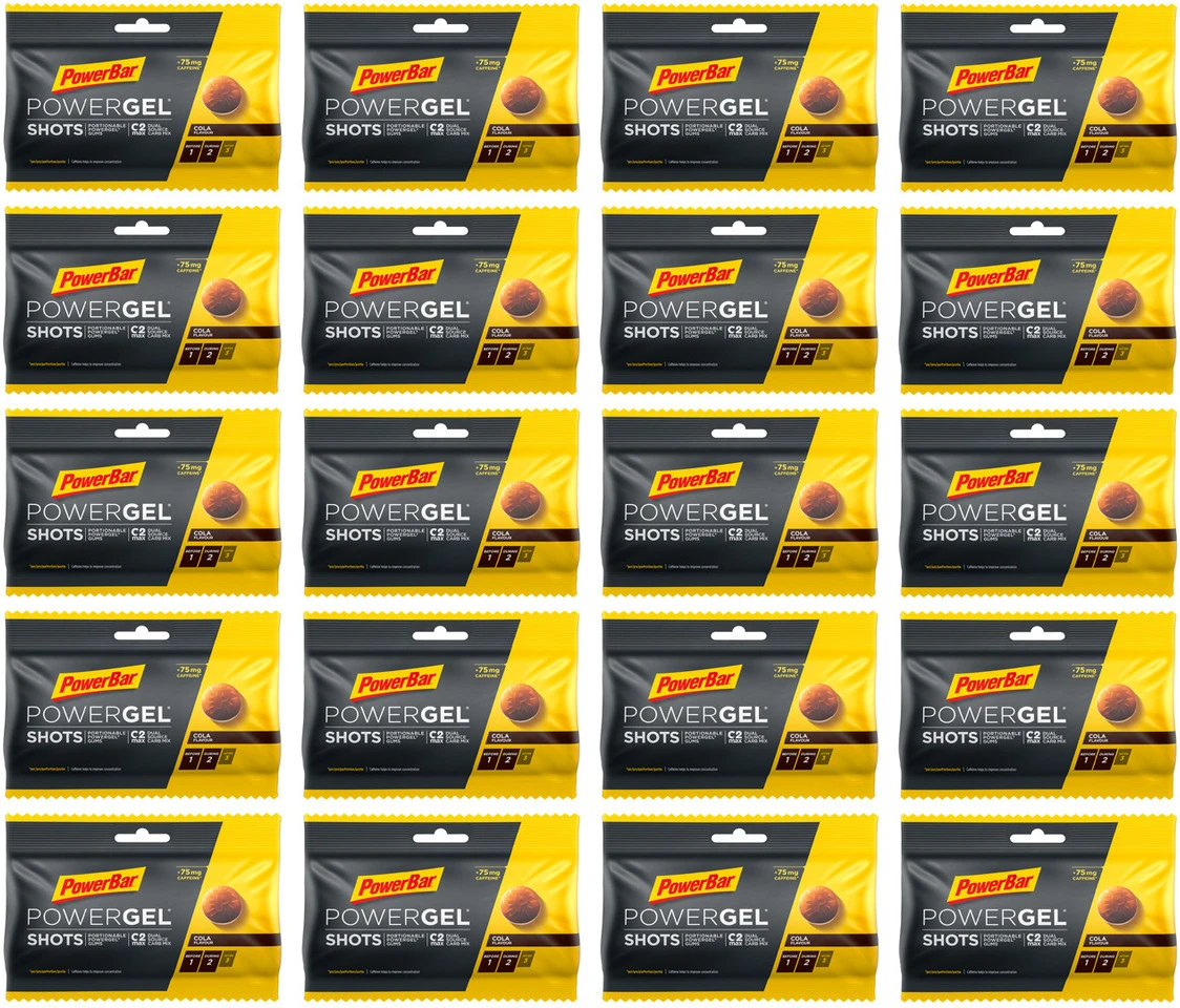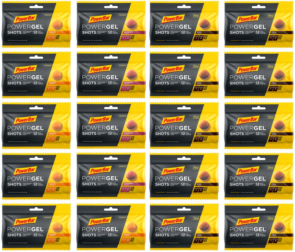 10 x Beutel PowerBar PowerGel Shots Fruchtgummis, Nettofüllmenge 600 g, cola – caffeine6 x Beutel PowerBar PowerGel Shots Fruchtgummis, Nettofüllmenge 360 g, orange4 x Beutel PowerBar PowerGel Shots Fruchtgummis, Nettofüllmenge 240 g, raspberry