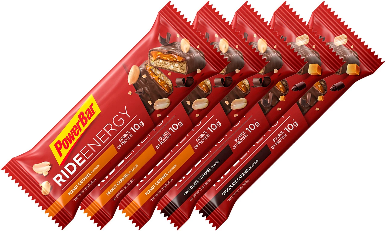 2 x Riegel PowerBar Ride Energy, Nettofüllmenge 110 g, peanut-caramel2 x Riegel PowerBar Ride Energy, Nettofüllmenge 110 g, chocolate-caramel1 x Riegel PowerBar Ride Energy, Nettofüllmenge 55 g, coco-hazelnut caramel
