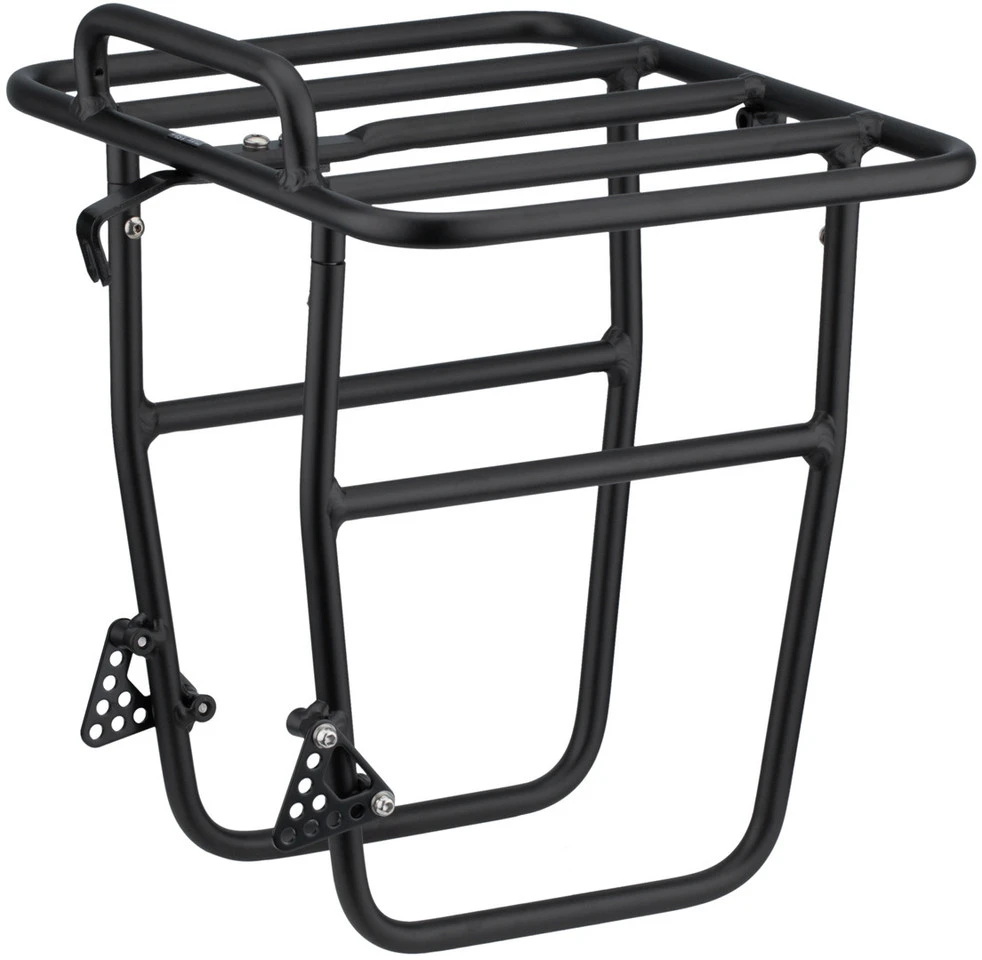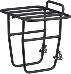 Die Pizza von Specialized ist ein Gepäckträger fürs Vorderrad von 28″ City- und Tourenrädern. An den 13 mm dicken Aluminium-Streben können seitlich Packtaschen angebracht werden. Auch oben auf der großen Auflagefläche ist Platz für Gepäck, wobei die Maximalzuladung 15 kg beträgt. Der Träger ist zusammenklappbar und passt dann (fast) in eine Pizzaschachtel.