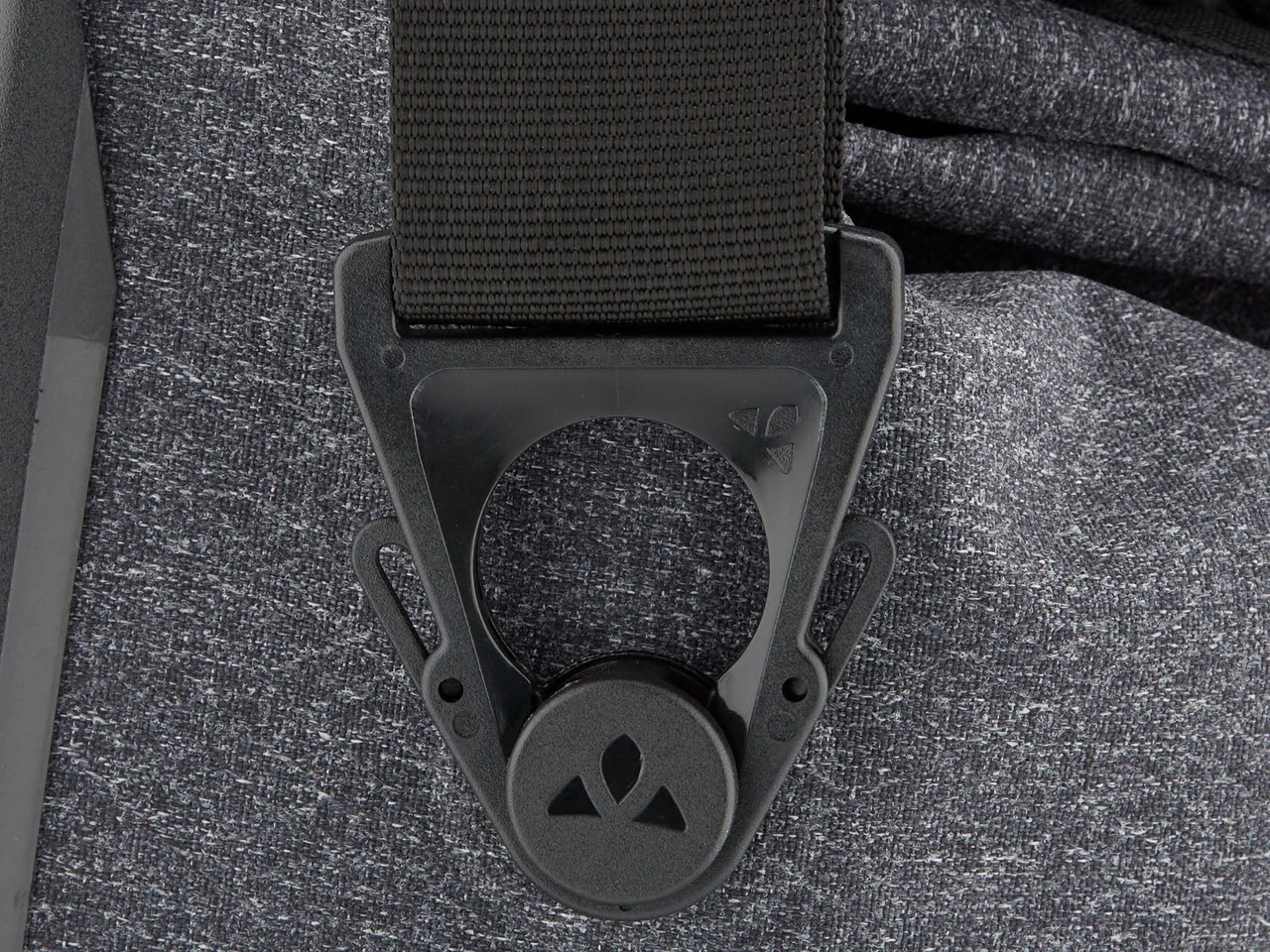 Intelligente Befestigung fĂŒr SchultertrĂ€ger. Der TrĂ€ger wird ĂŒber eine Schnalle gelöst, an der Tasche bleibt nur ein Knopf sichtbar. Der eingebaute Drehstopp verhindert ein Abkippen der Tasche wĂ€hrend des Tragens.